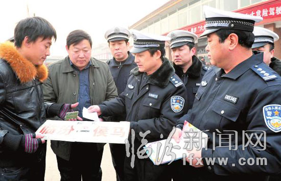 1月18日,市公安局交警支隊的工作人員在為公路營運人員發放春運運營證書。當日,全市2011年春運道路交通安全工作啟動,交警部門工作人員設立宣傳點、發放手冊,全力保障春運工作順利開展。 記者 閆銳鵬 攝