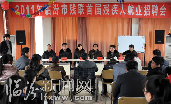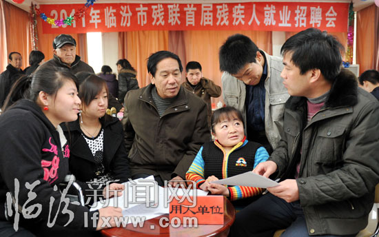 臨汾新聞網(wǎng)訊 1月14日,臨汾市2011年首屆殘疾人就業(yè)招聘會(huì)在臨汾市殘疾人職業(yè)培訓(xùn)學(xué)校舉行,40余位殘疾人朋友與用人單位舉行了面對面雙向選擇,旨在以專場招聘會(huì)為平臺(tái),拓寬殘疾人就業(yè)新渠道。(記者閆銳鵬 攝影報(bào)道)