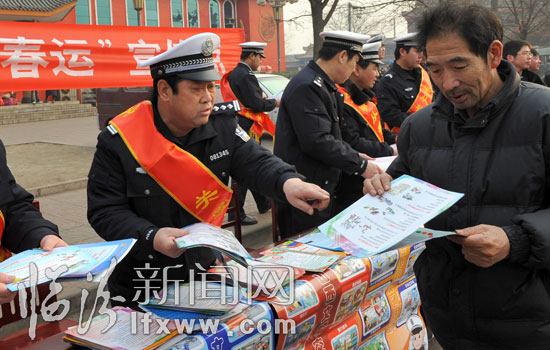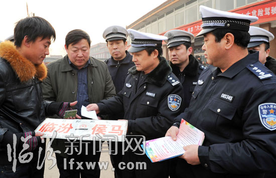 1月19日,臨汾市公安交警在向司乘人員講解道路安全手冊。