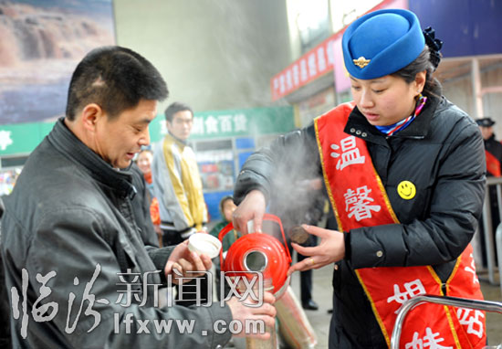 1月19日,臨汾市長途客運站的工作人員在為乘客到開水。