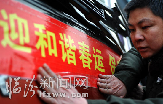 1月19日,臨汾道路運輸管理處的工作人員在張貼春運標語。