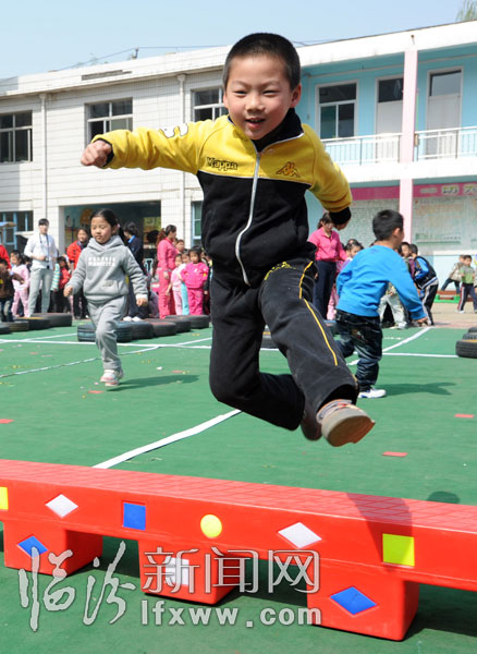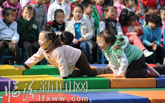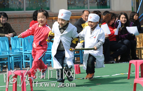 4月12日,臨汾市幼兒園小朋友在進行愛心趣味運動比賽。