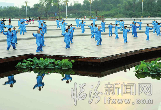 近日,市區濱河公園九州廣場內,數百名太極拳愛好者正在晨練。濱河公園是我市去年完工的一項重點工程,這里湖水蕩漾,荷花盛開,目前是我省標準最高,環境最美的公園之一,每天都吸引眾多的市民鍛煉身體和游玩。 張旦 攝