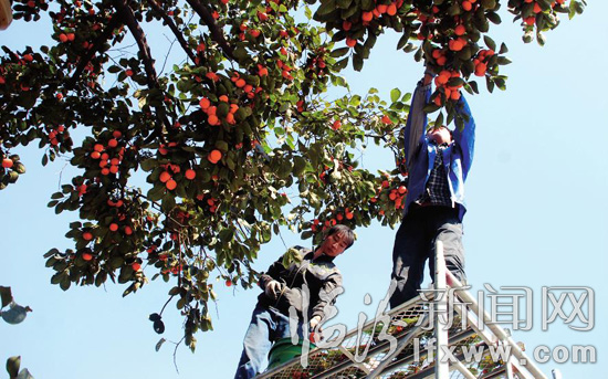 金秋十月,花果飄香,市綠化一隊出動120余人,對8條街道1500余株柿子樹上的柿子進行了采摘。圖為工作人員在市區鼓樓東大街采摘柿子。記者 李自強 攝