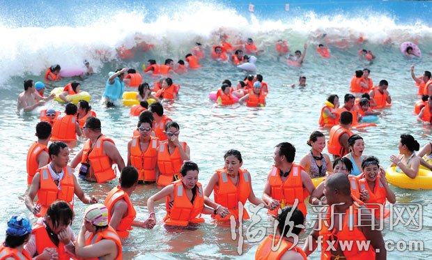 8月15日,市民在臨汾市區華堯水上樂園體驗“海嘯”來襲。當日我市的最高氣溫達到37攝氏度,市民們紛紛走進游泳館、水上樂園戲水納涼,躲避“秋老虎”。