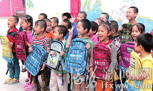 9月2日,洪洞縣大槐樹鎮玉峰雙語小學的留守兒童高興的領到新書包和文具。當日,洪洞縣朗格軟體家具有限公司的愛心志愿者們來到玉峰雙語小學,為這里的50余名留守兒童送來了書包和文具,同時與孩子們結成愛心幫扶對子,在心里上和精神上給予更多的關愛。 本報記者 閆銳鵬 攝