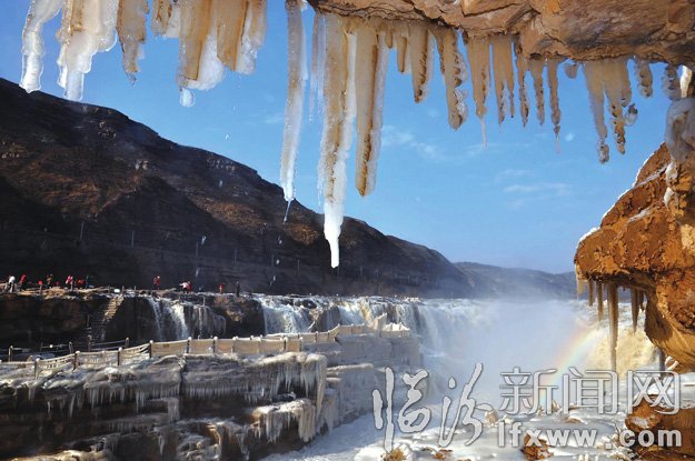 12月6日,游客在吉縣黃河壺口瀑布景區欣賞拍攝冰掛景觀。近日,受持續降溫天氣影響,黃河壺口瀑布出現流凌,飛濺的浪花在瀑布兩岸形成冰掛,吸引了眾多游人前往觀賞。 呂桂明 攝