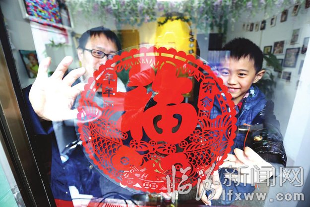 2月11日,陰歷小年,堯都區西趙村的張先生和兒子一起貼窗花,妝點“年味”。記者 蘇亞兵攝