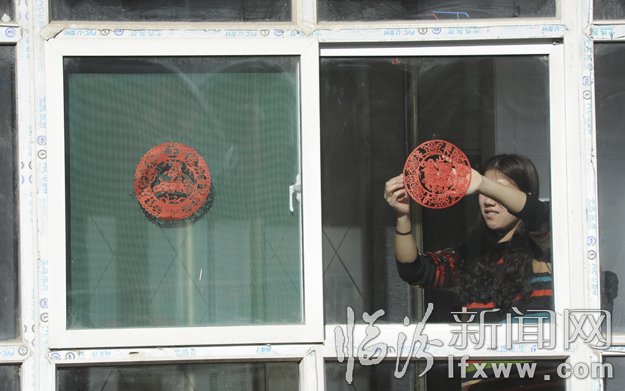2月16日,在山西省臨汾市浮山縣佐村,李紅梅在張貼廉政窗花。