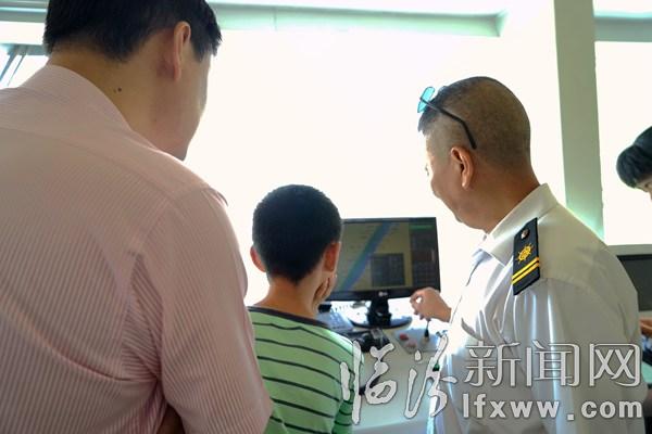 7、船員向暑期隨家人出游的小游客講解巨輪駕駛中的知識。
