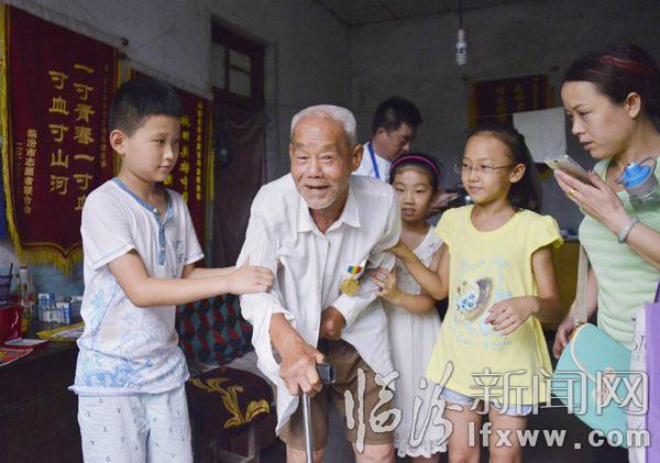 臨汾新聞網訊 7月29日,在“八一”建軍節來臨之際,來自臨汾市南街小學、時代風華學校的孩子們由媽媽們帶領來到堯都區堯廟鎮下靳村看望了抗戰老兵梁吉孚老人,并帶去西瓜、奶粉等物品。在院子里家長和孩子們聆聽抗戰老兵講述戰爭年代的故事,讓孩子們更多的了解歷史,珍惜現在的生活。據了解:梁吉孚老人生于1931年,12歲當兵(1943年),1946退役回鄉務農。 孫國芳 攝