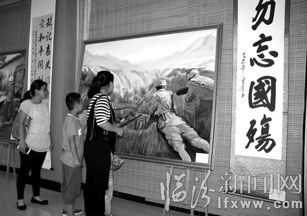 在曲沃縣老干部局舉辦的“紀念中國抗戰70周年和世界反法西斯戰爭勝利”為主題的書畫展中,社會各界書畫愛好者正在觀看書畫作品。張榮攝