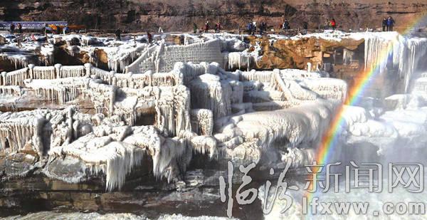 臨汾新聞網訊 12月27日,眾多游客在吉縣黃河壺口瀑布欣賞冰掛美景。近日,受降溫天氣影響,黃河壺口段開始大面積流凌,飛濺的浪花和水霧在兩岸迅速凝結,形成一排排美麗壯觀的冰掛,與瀑布中飛舞的彩虹交相輝映,可謂是美不勝收。 呂桂明攝