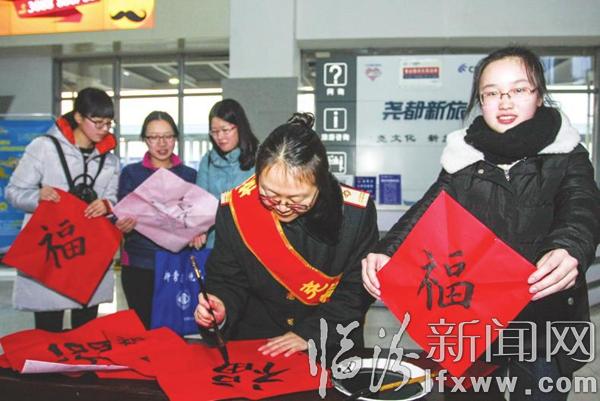 臨汾新聞網(wǎng)訊 2月2日下午,臨汾西站堯都新旅的工作人員在候車大廳現(xiàn)場(chǎng)書寫春聯(lián)、“福”字,免費(fèi)發(fā)放給旅客,為旅客送上新春的祝福,并祝他們旅途愉快。