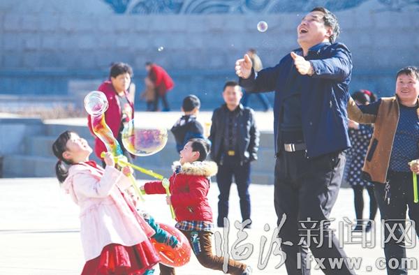 臨汾新聞網訊 2月20日,天氣晴朗,市民們紛紛走出家門,感受春的氣息。在九州廣場上市民們三三兩兩地聚在一起聊天談笑,孩子們或手拿風車,或放飛風箏,或追逐著五彩肥皂泡,享受著春天帶來的快樂。