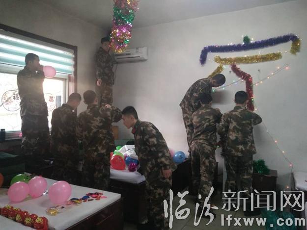 上午8點半,士兵們已經開始布置宿舍,十人一間的宿舍干凈整潔,即使是為了迎新年做裝扮,每個人也各有分工,全力合作保證效率和宿舍的規整。二排6班的張博捷是一個月前剛從新兵營分配到三中隊的大學生新兵。張博捷不是第一次離家過年,上一次是還在上大一時和朋友們一起在玩鬧中度過?!斑@次是和一起同吃同住的兄弟過年,而且大家都有責任在身,情感上更親近?!钡谝淮卧诓筷犨^年,他說自己充滿了好奇和期待,“想家人人都會想,特別是鞭炮聲響起來的時候,熱鬧聲中最覺得孤獨?!?/p>