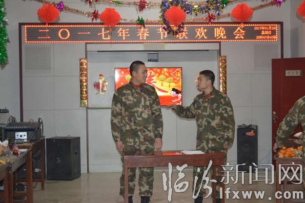辦公室里,通訊員賈金志正在打掃衛生,他是山東聊城人,“入伍兩年了沒回過家,想家也要努力克服。”賈金志說:“部隊會在節假日發制式手機給我們,可以給家里人打電話、視頻聊天,很大程度上緩解了思家之苦?!边@個18歲的陽光大男孩樂觀開朗,“和在家里過年不同,在部隊只有到臘月三十才能感受到年味?!?/p>