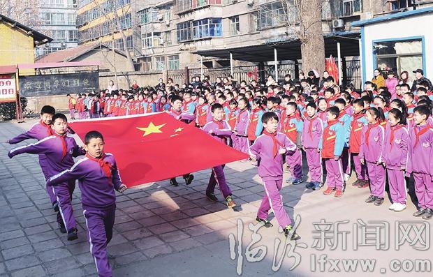 臨汾新聞網訊 2月13日,在臨汾市興國學校小學部,師生們正在參加升國旗儀式。新學期伊始,該學校將升國旗作為開學第一課,通過國旗下的宣誓和演講活動,培養全體少先隊員的愛國主義情操以及勤奮學習和刻苦鉆研的精神。 記者 閆銳鵬 攝