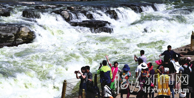 臨汾新聞網訊 5月12日,游客在吉縣黃河壺口瀑布景區游覽。近日,受黃河干流來水量減少和泥沙沉淀影響,壺口瀑布水色明顯變清,呈現“清流飛瀑”的別樣美景。