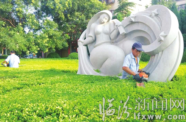 臨汾新聞網訊 7月22日清晨6時許,在兵站路、南外環路段,臨汾市城市綠化一隊的綠化工人們正在對行道樹進行修剪作業。連日來,綠化工人頂著烈日修剪花草,“花草妝滿城,佳木送涼陰”,他們默默無聞的勞作,將城市裝點得格外亮麗。