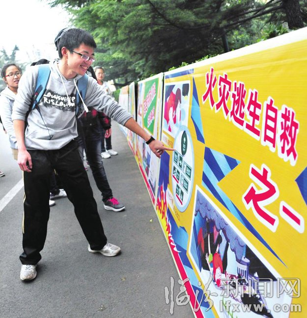 11月9日,山西師范大學舉行了“消防安全”為主題的“119“防火災宣傳活動,通過讓學生在“重消防,促平安,構建和諧未來”的條幅上簽名、將畫著禁止吸煙、手動報警、滅火器、緊急出口等消防標示圖貼在展板上、展示關于消防安全的海報、向師生們散發防火宣傳單等形式,普及廣大師生消防安全知識,增強消防安全意識。 饒二保 尤彥榮 攝