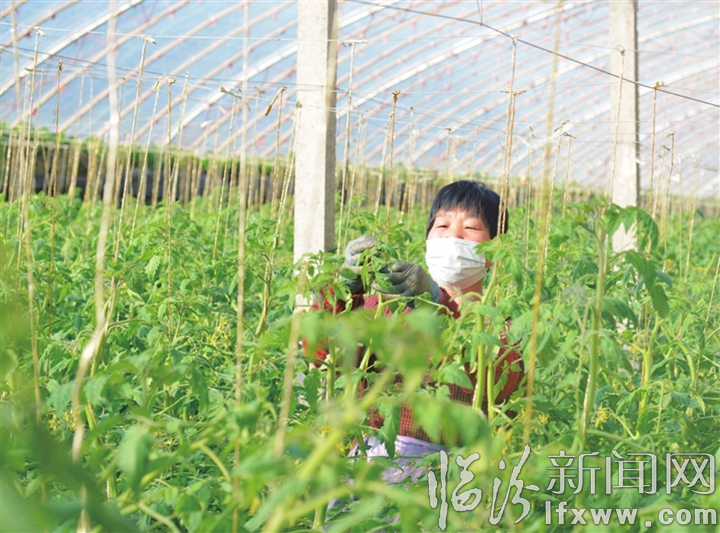 臨汾新聞網訊 連日來,襄汾縣一手抓疫情防控,一手抓農業生產,確保實現全年農業發展目標。圖為永固鄉眾樂家庭農場經營者正在管護大棚西紅柿。