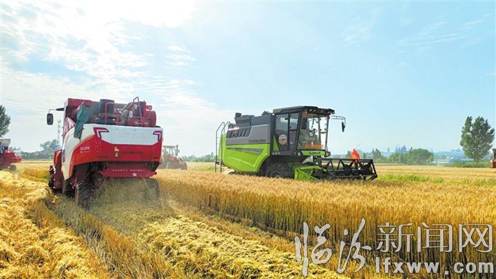 臨汾新聞網訊 6月1日,侯馬市上馬街道辦事處南張里村小麥開鐮收割,田間地頭一派繁忙的機收景象。