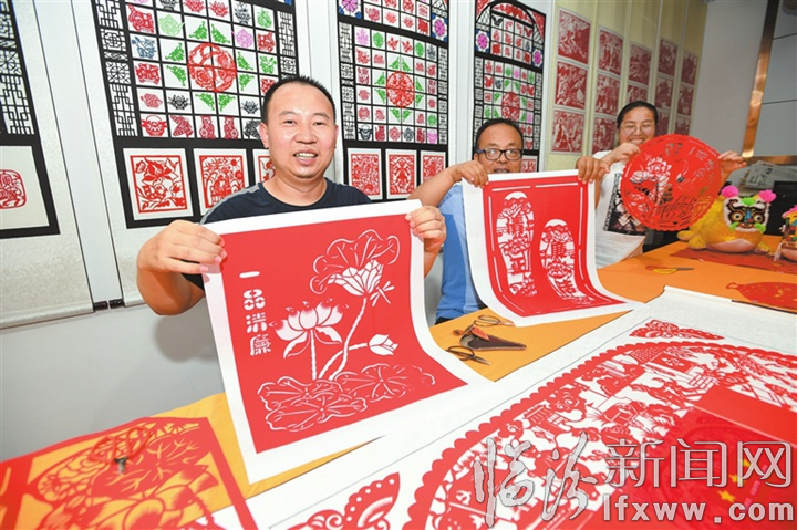 臨汾新聞網訊 8月1日,在浮山縣剪紙傳習基地張寧剪紙藝術館,張寧團隊在展示清廉文化剪紙作品。該基地立足“中國剪紙之鄉”的非遺傳統文化底蘊,以及本土文化資源和人才優勢,加強廉潔題材作品創作,著力打造集思想性、藝術性和觀賞性于一體的優秀廉潔文化藝術精品,推動浮山縣廉潔文化陣地建設。