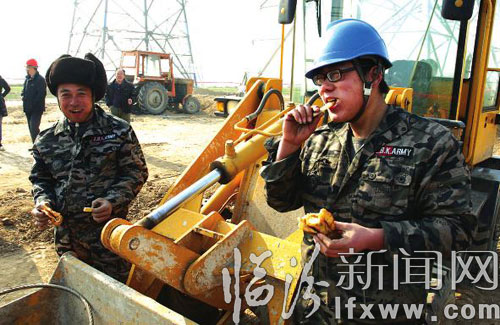 一番緊張忙碌過后,轉眼已是下午1點,一個偌大的保溫桶里,盛放著工人們的午餐。油餅、咸菜、白開水……一頓簡單的午飯之后,來不及耽擱,工人們又投入到各自的崗位,忙乎了起來。