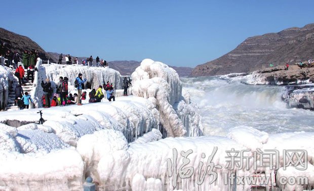 2013年12月29日,游客們在吉縣壺口瀑布景區(qū)游玩拍照。連日來,隨著氣溫的降低,黃河壺口瀑布兩岸形成了長短不齊、形狀各異的冰掛和冰柱,同時,景區(qū)還出現(xiàn)了流凌景觀,吸引了眾多游客和攝影愛好者冒著嚴(yán)寒前來觀賞。