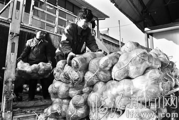 臨汾新聞網訊 日前,曲沃縣南吉菜市場向長期合作的蔬菜供應商了解蔬菜儲備數量、質量、種類等信息,進行蔬菜儲備工作,確保春節前蔬菜供應充足、價格穩定。圖為工人正在搬運蔬菜。(張榮)