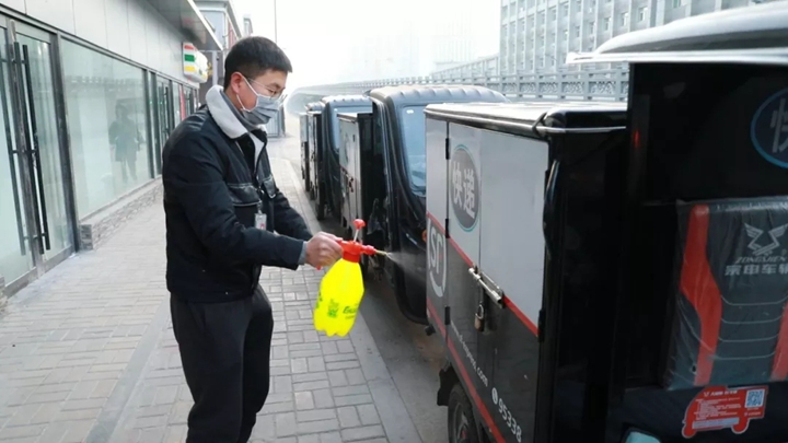 楊永棟載著消毒完畢的52件快遞,開始了配送。他的第一站,是位于雙塔東街的國大藥房。