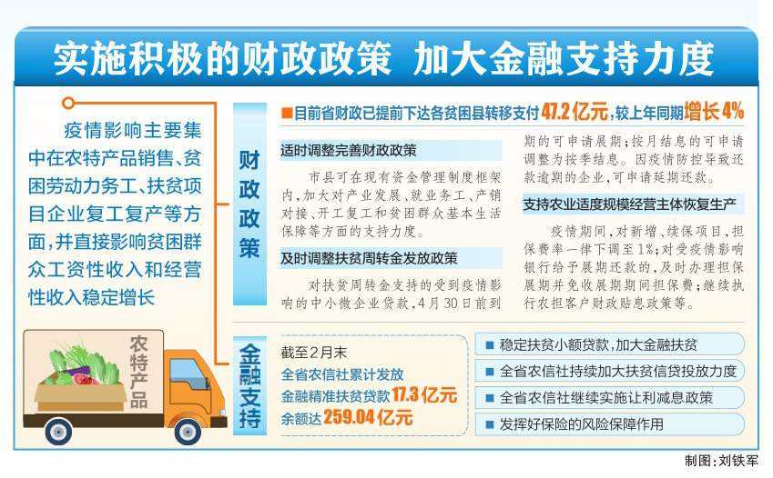 產(chǎn)業(yè)扶貧,是穩(wěn)定脫貧的根本之策,也是鞏固脫貧成果防止返貧的關鍵措施。面對突如其來的疫情,實施積極的財政政策,加大金融支持力度,對于解決產(chǎn)業(yè)發(fā)展難題、增強致富內(nèi)生動力十分必要。2月28日,省政府辦公廳印發(fā)《關于克服疫情影響確保貧困群眾產(chǎn)業(yè)就業(yè)增收有關政策措施的通知》(下稱《通知》),在資金項目、金融扶貧等方面提出多條具體舉措。記者就此采訪了有關部門、單位。