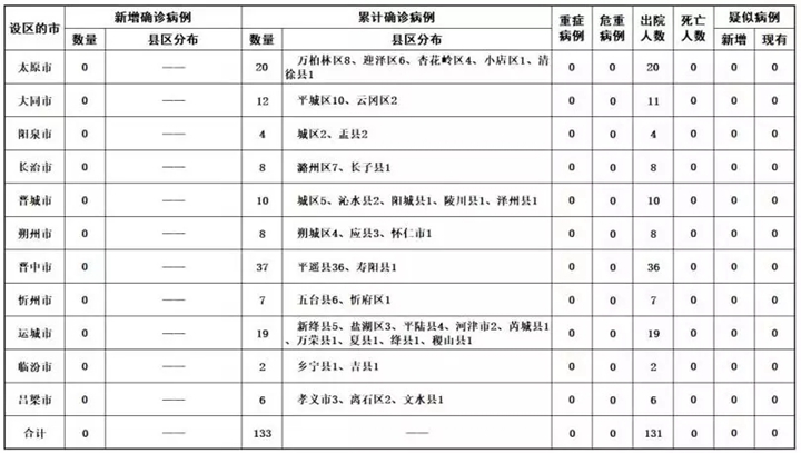 截至3月11日24時(shí),山西省11個(gè)市累計(jì)報(bào)告新型冠狀病毒感染的肺炎確診病例133例。其中: