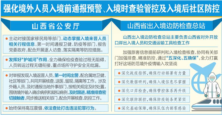 對(duì)于群眾舉報(bào)發(fā)現(xiàn)入境返晉人員,公安機(jī)關(guān)將按照省廳下發(fā)的《防控境外疫情輸入雙十條》要求,第一時(shí)間出警,配合屬地衛(wèi)健、社區(qū)等部門,共同開(kāi)展核查、送醫(yī)、留觀、隔離等工作。涉及外籍人員,及時(shí)通報(bào)當(dāng)?shù)赝馐虏块T,按照相關(guān)規(guī)定及時(shí)處置。同時(shí),圍繞境外輸入確診病例和疑似病例,及時(shí)跟進(jìn),精準(zhǔn)排查密切接觸者,同步推送相關(guān)部門,配合開(kāi)展核查、防控工作。
