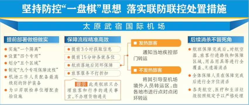 防境外疫情輸入的任務(wù)復(fù)雜、艱巨而重要,山西航產(chǎn)集團(tuán)所轄的太原武宿國際機(jī)場按照省委、省政府和民航局疫情防控工作要求,迅速行動,在指揮部的統(tǒng)一指揮下,堅持防控“一盤棋”思想,與其他部門及相關(guān)航空公司,建立聯(lián)防聯(lián)控機(jī)制,落實(shí)聯(lián)防聯(lián)控處置措施。