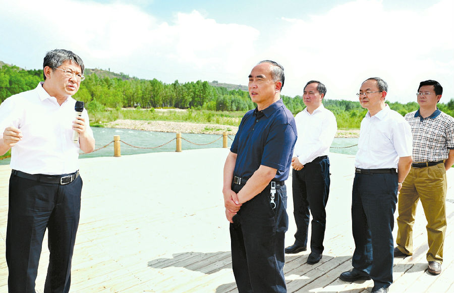 6月5日,省長、省總河長、汾河河長林武深入寧武、靜樂、婁煩三縣調研汾河治理工作,圖為林武在靜樂縣汾河川國家濕地公園察看濕地景觀并詳細了解保護修復情況。 記者李兆民攝
