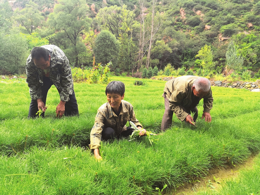 劉桂珍(中)和鄉親們在苗圃拔草。記者王利強攝