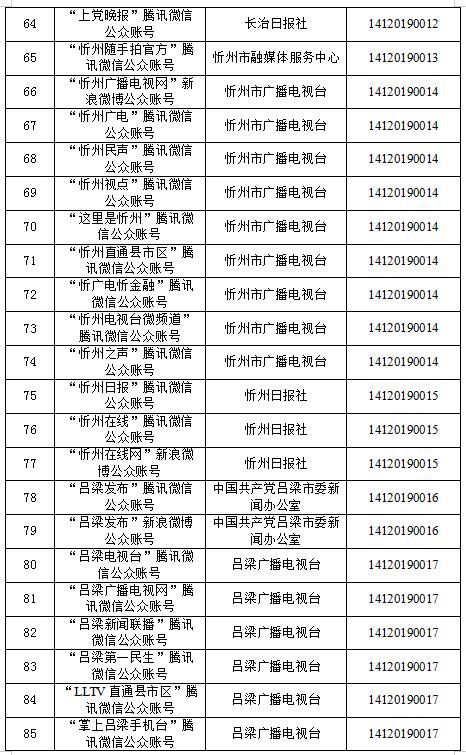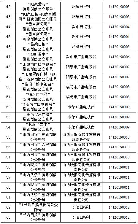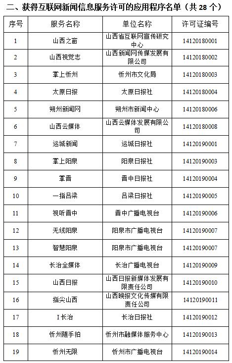 截至2020年10月14日,經山西省互聯網信息辦公室許可的屬地互聯網新聞信息服務單位共計39家,具體服務形式包括:互聯網站40個,應用程序28個,論壇1個,公眾賬號157個,共計226個服務項。
