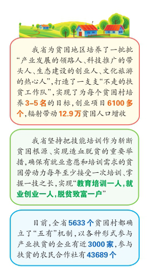 做給農民看、教會農民干、帶著農民賺,把產業留在鄉村,把就業崗位留給農民,把產業增值收益留給農民,龍頭帶動格局正釋放出強大的帶貧益貧動能。目前,全省5633個貧困村都確立了“五有”機制,以各種形式參與產業扶貧的企業有近3000家,參與扶貧的農民合作社有43689個。