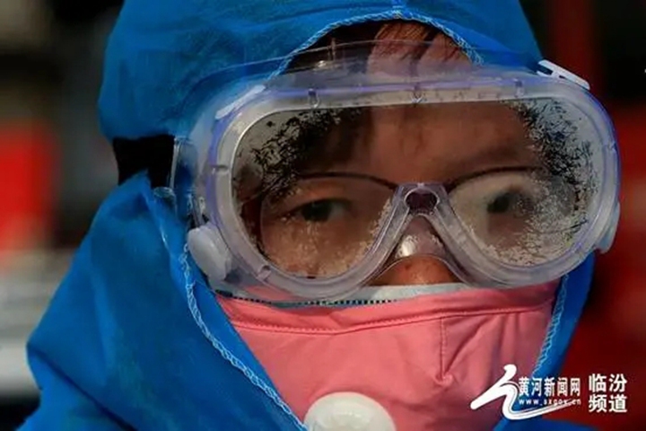 2020,最想感謝默默無聞的志愿者,厚厚的護目鏡背后,是他們甘愿付出,一心為民的志愿精神。圖為:長臨高速臨汾市高速東口,志愿者為筑牢抗擊疫情防線,防護服一穿就是6個小時,哈氣也蒙住了眼睛,汗水濕透了衣服。記者賈根生 高波 報道