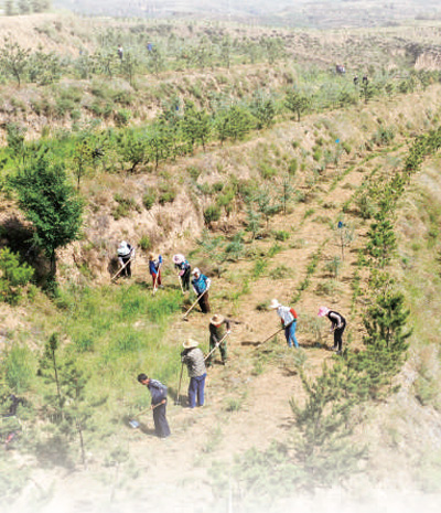 嵐縣普明鎮(zhèn)一家造林專業(yè)合作社的社員們在管護鋤草(攝于今年6月)。 |