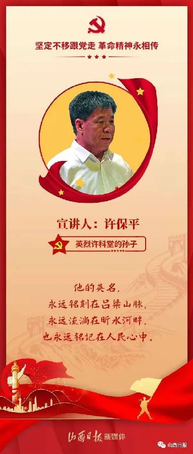 許科堂,男,1912年生,臨汾市大寧縣人,1938年7月1日加入中國共產黨。1937年“七七”事變后,許科堂加入大寧縣犧牲救國同盟會,帶領群眾開展抗日救亡運動。1938年先后擔任白杜村黨支部書記和一區農救會宣傳委員。1939年5月,調到縣農救會工作。1945年6月,任大寧縣人民民主縣長。1947年敵人偷襲劉家垣村,在突圍中英勇就義,年僅35歲。