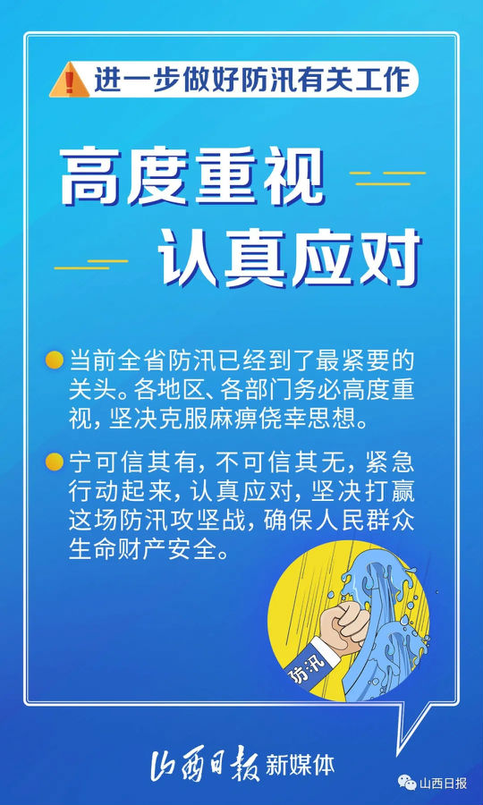 據氣象部門預報,預計7月17-21日,全省將有一次強降水天氣過程。從區域看,我省大同南部、忻州、太原、陽泉、晉中、長治、晉城、臨汾、運城東部等地的部分地區有大到暴雨,晉城、長治、臨汾東部,晉中平川等地的局部地區有大暴雨,并伴有短時強降水雷暴大風、冰雹等強對流天氣。為全力迎戰新一輪強降雨過程,山西就進一步做好防汛有關工作進行緊急通知!