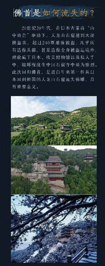 7月24日上午,天龍山石窟“第8窟北壁主尊佛首”正式回歸原屬地,亮相當日在太原市天龍山石窟博物館開幕的“復(fù)興路上 國寶歸來”特展,并在此長期陳列展出。它成為近百年來第一件從日本回歸天龍山石窟的珍貴流失文物。