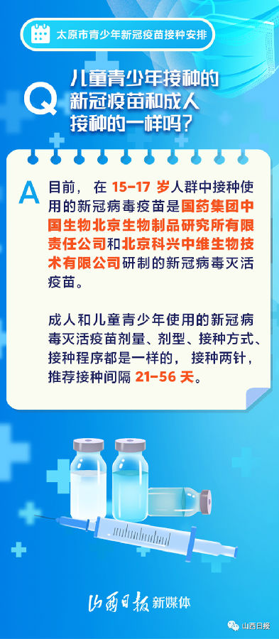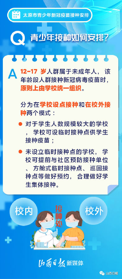 根據(jù)國(guó)家、山西省統(tǒng)一部署,太原市從8月1日起,已開(kāi)始對(duì)12-17歲人群分年齡段、分時(shí)段安全穩(wěn)妥分步推進(jìn)新冠病毒疫苗接種工作,力爭(zhēng)盡早建立人群免疫屏障,持續(xù)鞏固疫情防控戰(zhàn)略性成果。那么,青少年接種如何安排?注意事項(xiàng)有哪些?太原疾控中心針對(duì)熱點(diǎn)問(wèn)題給予解答!