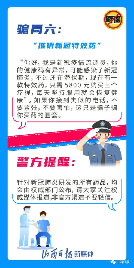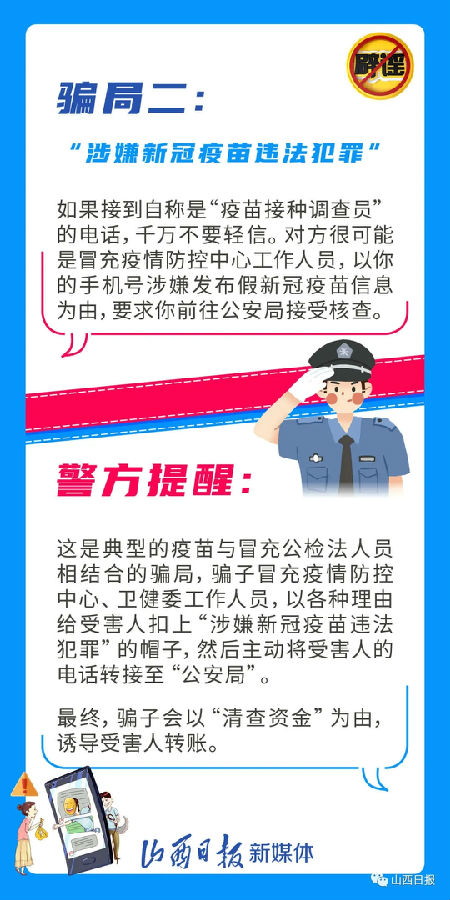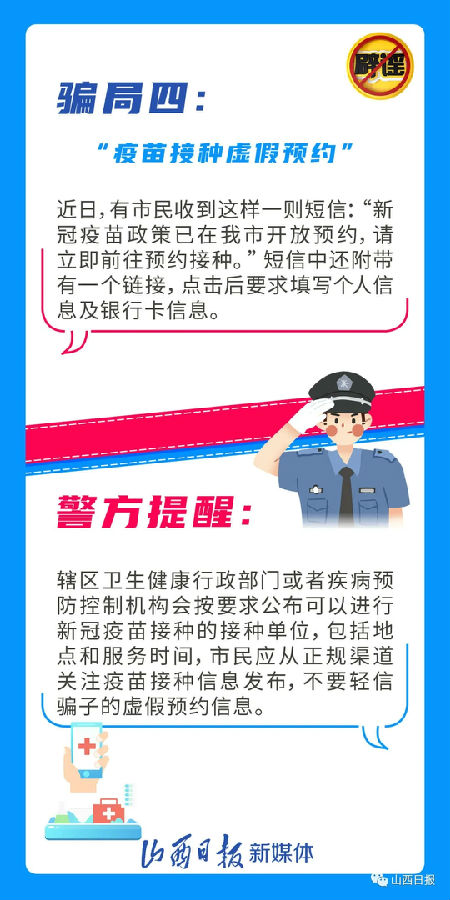 近日,新冠疫苗接種成為關注焦點,一些不法分子乘機“蹭熱度”實施詐騙。近日,太原警方公布了常見的“新冠疫苗”六大騙局,提醒廣大市民收到這些信息不要輕信,可撥打96110咨詢。