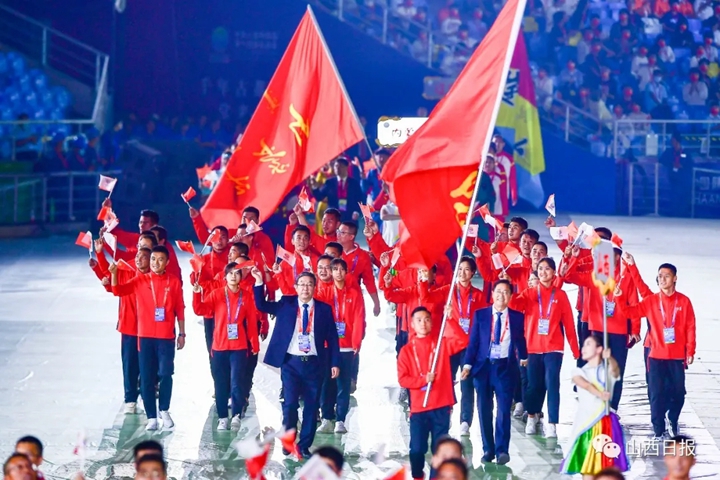 第十四屆全運會開幕式上的高光時刻,莫過于各參賽代表團依次入場。當晚,山西代表團排在裁判員隊伍、北京、天津和河北代表團之后,第五個出場。在有著“長安花”別稱的西安奧體中心體育場,“山西紅”更為跳躍閃亮。奧運會“四朝元老”、全運會“五朝元老”……在賽場上拼搏了19年的蹦床名將董棟,執(zhí)旗入場,成為山西代表團“走在最前面的那個人”。