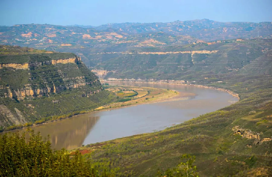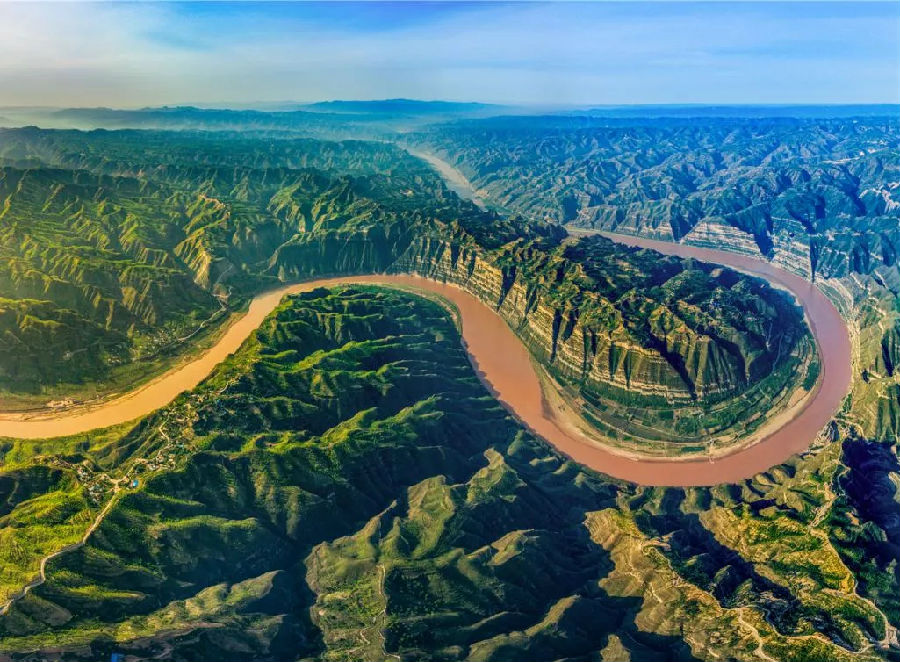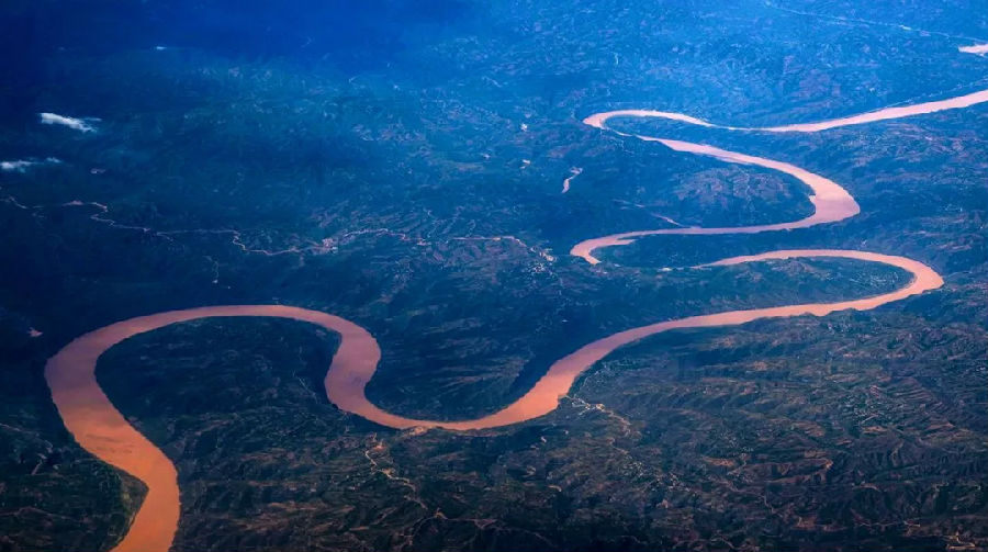 蛇曲之美,既有溫婉輕柔,也有氣勢(shì)磅礴。黃河流經(jīng)鄂爾多斯高原后,便進(jìn)入晉陜大峽谷,沿崇山峻嶺穿行流淌。這種類型的蛇曲叫作嵌入式蛇曲,河道形態(tài)宛如希臘字母“Ω”嵌于山巖之間。空中望去,河如巨龍,山似波浪,山河合奏出自然天成的黃河大合唱。