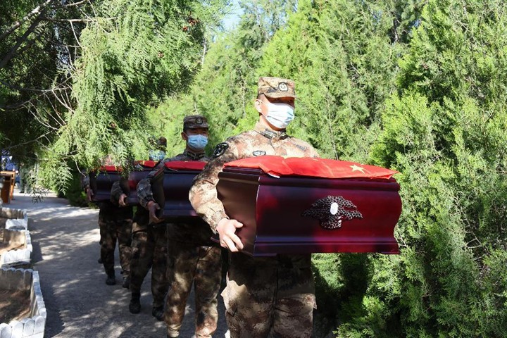 伴隨著深沉低回的《追悼號》,9名禮兵邁著整齊的步伐、緩緩前行,將烈士骨灰盒護送到烈士紀念碑前安葬。在莊嚴肅穆的氛圍中,全體人員向烈士獻花、鞠躬,表達對革命先烈的深切悼念和無限敬仰。
